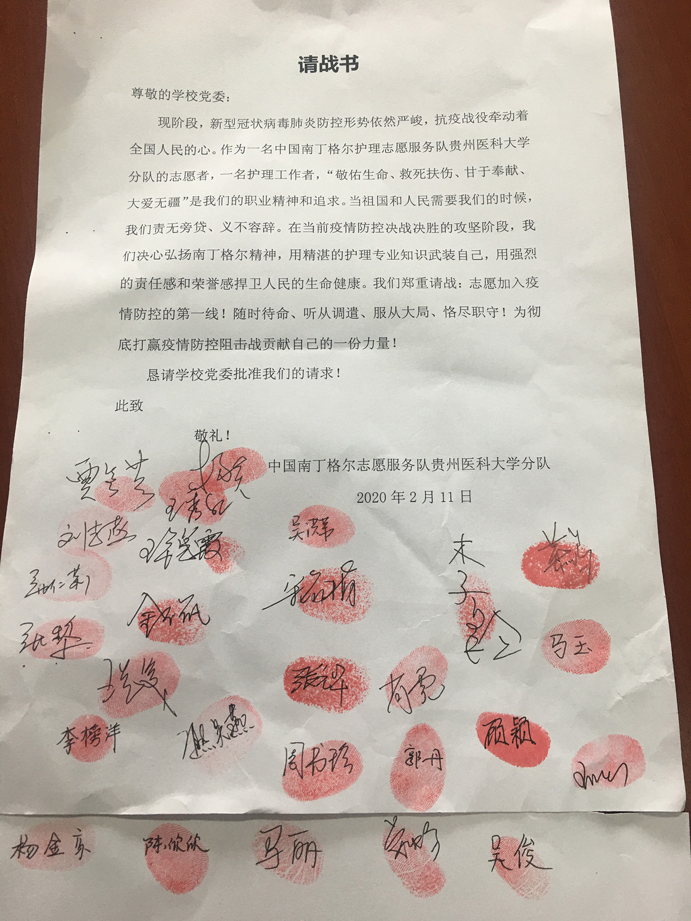 为了弘扬南丁格尔精神,保卫人民的生命健康,bevictor伟德官网师生与附属医院护理部团结一心,积极地投身于这场战“疫”之中,众多党员教师和南丁格尔志愿服务队的队员们纷纷请战,想为防控阻击战奉献出自己的一份力量。2月12日,公司、护理部请战的教职工党员和中国南丁格尔志愿服务队伟德官网bv1946分队的志愿者代表们在请战书上签下了自己的名字,郑重请战:志愿加入疫情防控的第一线!随时待命、听从调遣、服从大局、恪尽职守!为彻底打赢疫情防控阻击战贡献自己的一份力量!