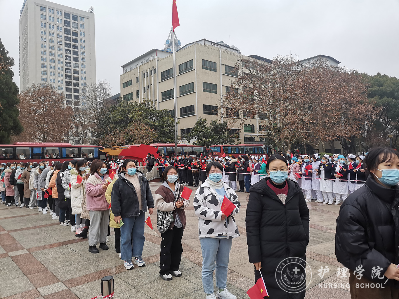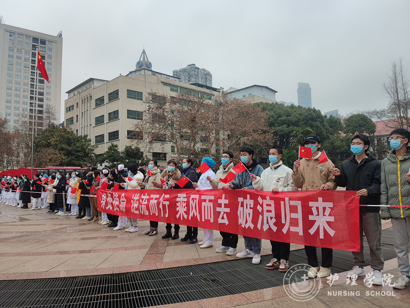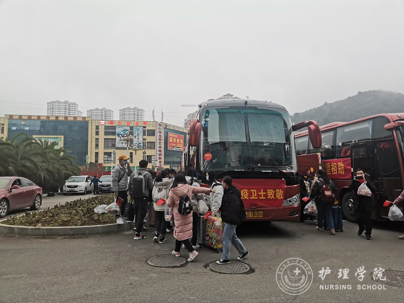 12月31日,经过一天的休整,bevictor伟德官网支援铜仁的师生在短暂的告别仪式后,跟随附属医院医疗队一同出发返回贵阳。返回时,等候在北校区道路两旁的师生高扬着国旗齐声呼喊:“欢迎回家!”,用掌声欢迎全体援铜的师生平安返回。“身负使命,逆行出征,乘风而去,破浪而归”。美丽的铜仁,留下了护理学子奉献的身影。
