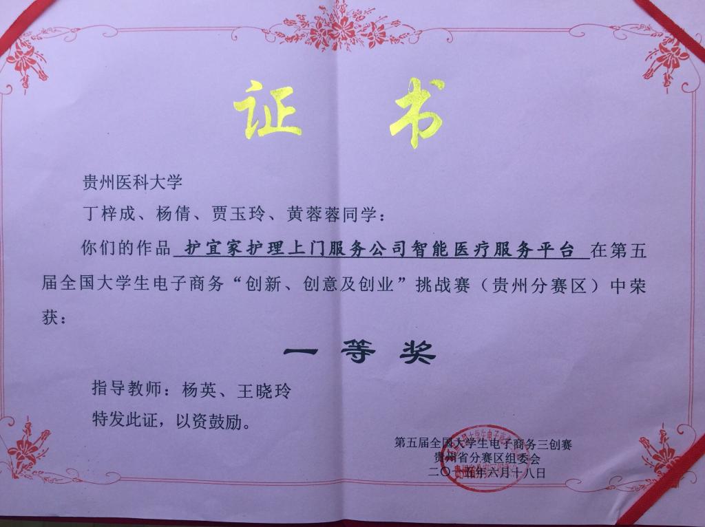 此次大赛共有来自全省各高校六十多支队伍参赛。在项目现场展示过程中,公司代表队向现场评委及同学进行了简短、精炼的介绍。随后,在答辩现场,公司学子以饱满自信的精神状态完成了PPT演示和现场答辩环节。经过评委们的认真评审,公司2012级贾玉玲、黄蓉蓉、杨倩、丁梓成同学的作品《护宜家护理上门服务公司智能医疗服务平台》荣获一等奖殊荣。