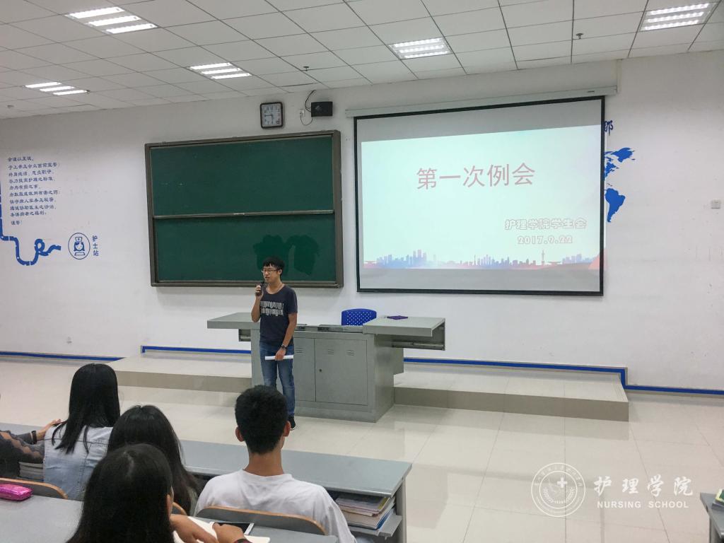本次例会共分为五项议程。首先,由礼仪部的薛露露同学带领大家进行本次例会的政治理论学习,内容是围绕《中华人民共和国国歌法》来展开的,通过本次学习,极大的增强了大家的爱国情怀;第二项,由副主席尹本渊向同学们宣读了员工会的规章制度,要求大家在以后的工作中都能严格遵守,严于律己;第三项,由副主席刘妍向大家介绍了员工会在过去一年开展活动的情况;第四项,由各部门副部长依次上台为大家介绍了各部门的主要职责,近期将要开展的活动,同时也希望2017级的新成员们能积极参与到活动中来;第五项,由分团委负责人王晓玲老师做总结发言,她希望2017级的新成员们能尽快融入到这个集体中来,同时端正思想,不忘初心,砥砺前行。