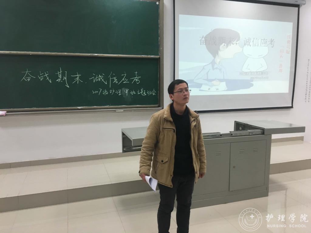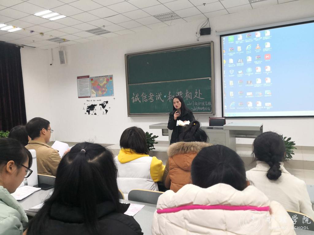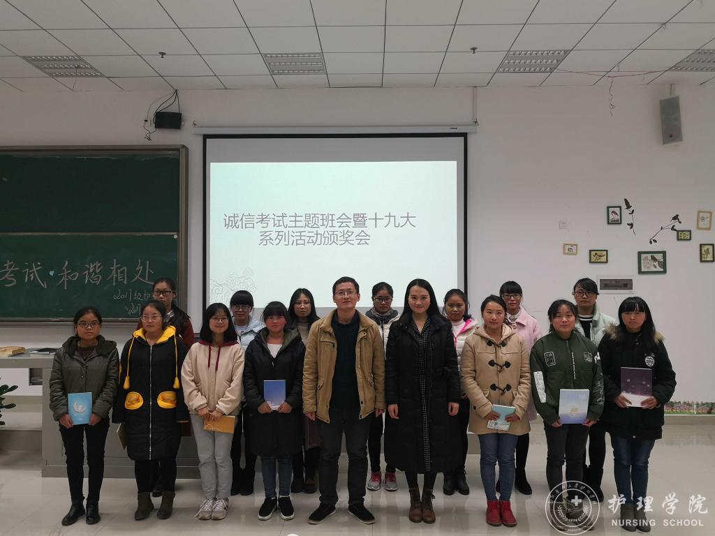 12月21日晚,bevictor伟德官网在南校区7404和7406教室开展诚信考试主题班会暨十九大系列活动颁奖仪式。此次班会由班主任吴俊、王丽,辅导员马景瑶和班级学习委员主讲,2017级护理甲班、乙班全体同学参加,班会由各班班长主持。