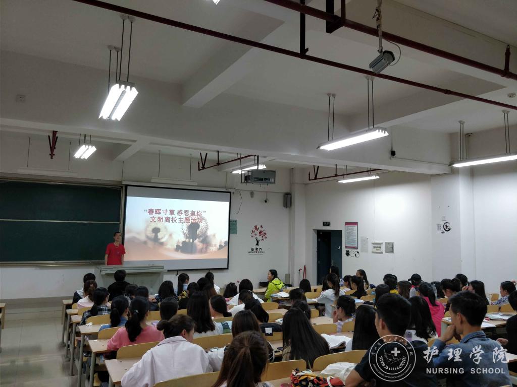 为增强毕业生自律和感恩意识,推进毕业生文明离校工作,5月8日下午,2018届毕业生在北校区4601教室开展了“春晖寸草,感恩有你”文明离校主题班会。班会由2014级护理本科班团支书文远哲主持。