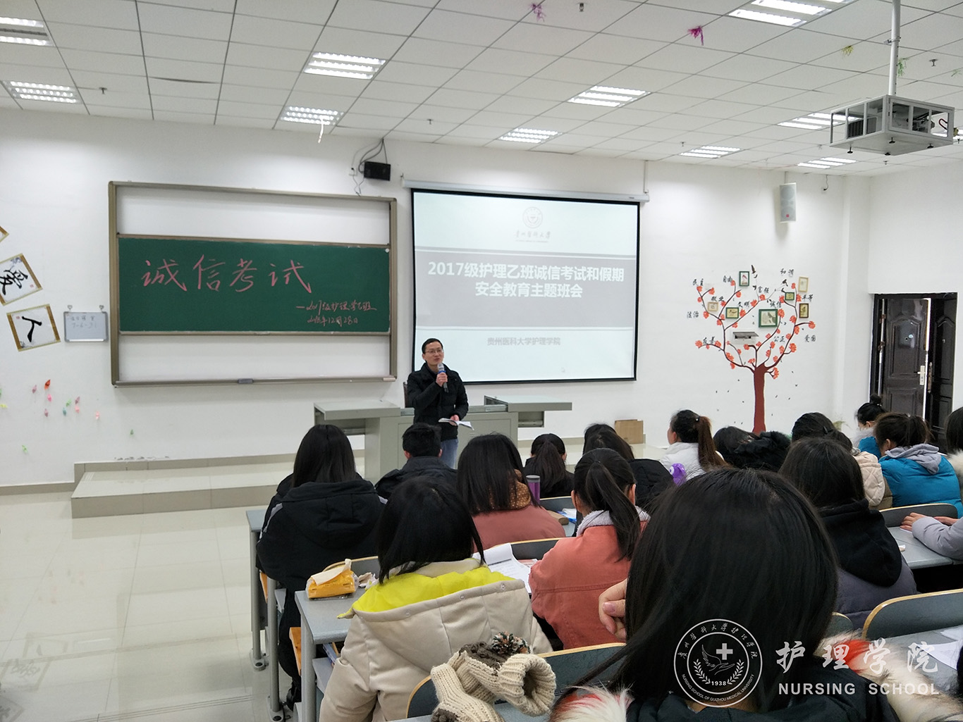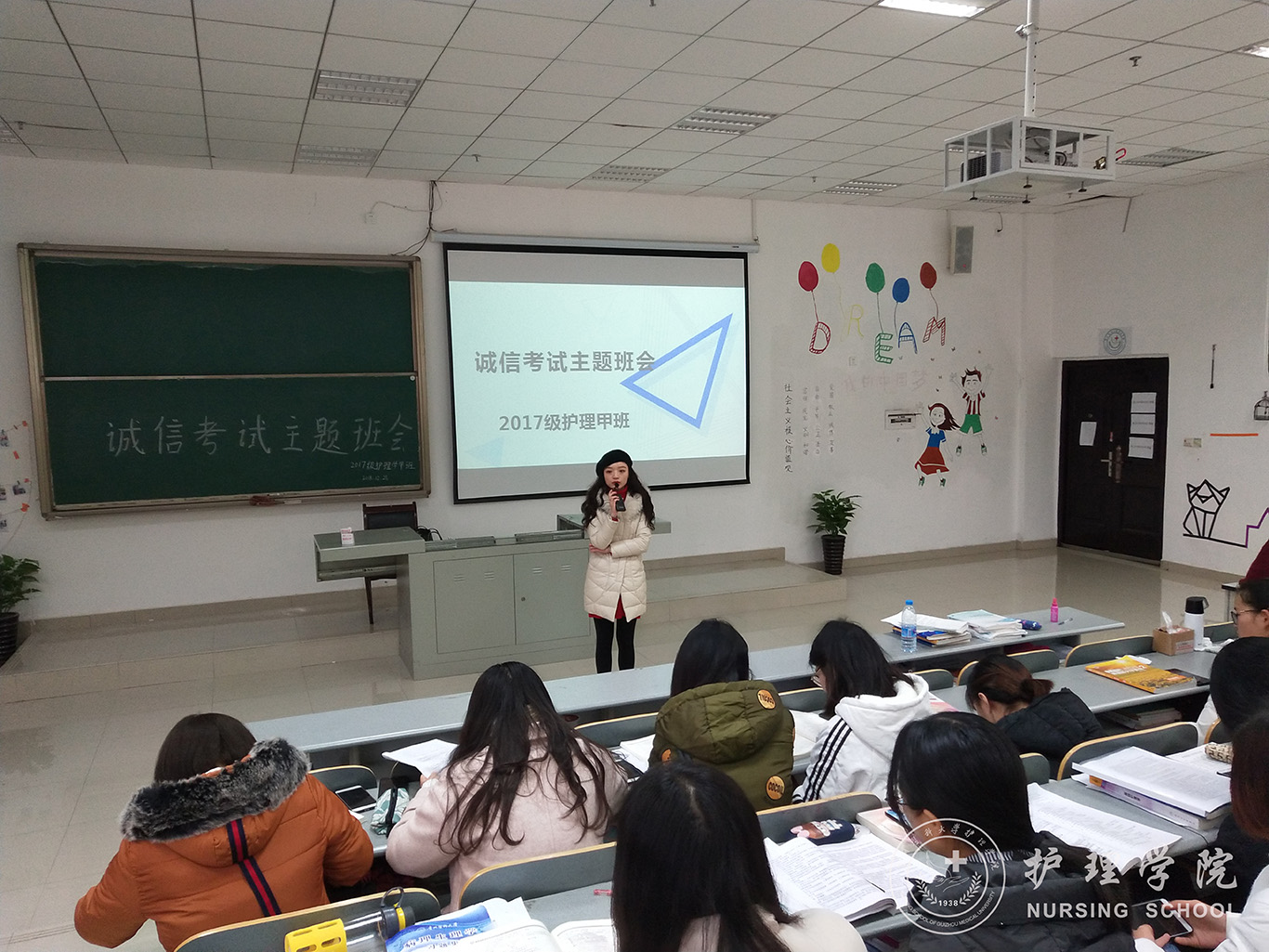 12月28日下午,bevictor伟德官网在南校区7404和7406教室开展诚信考试主题班会。班会由2017级护理甲班、乙班两班班长主持,班主任吴俊、王丽和辅导员马景瑶主讲,全体同学参加。