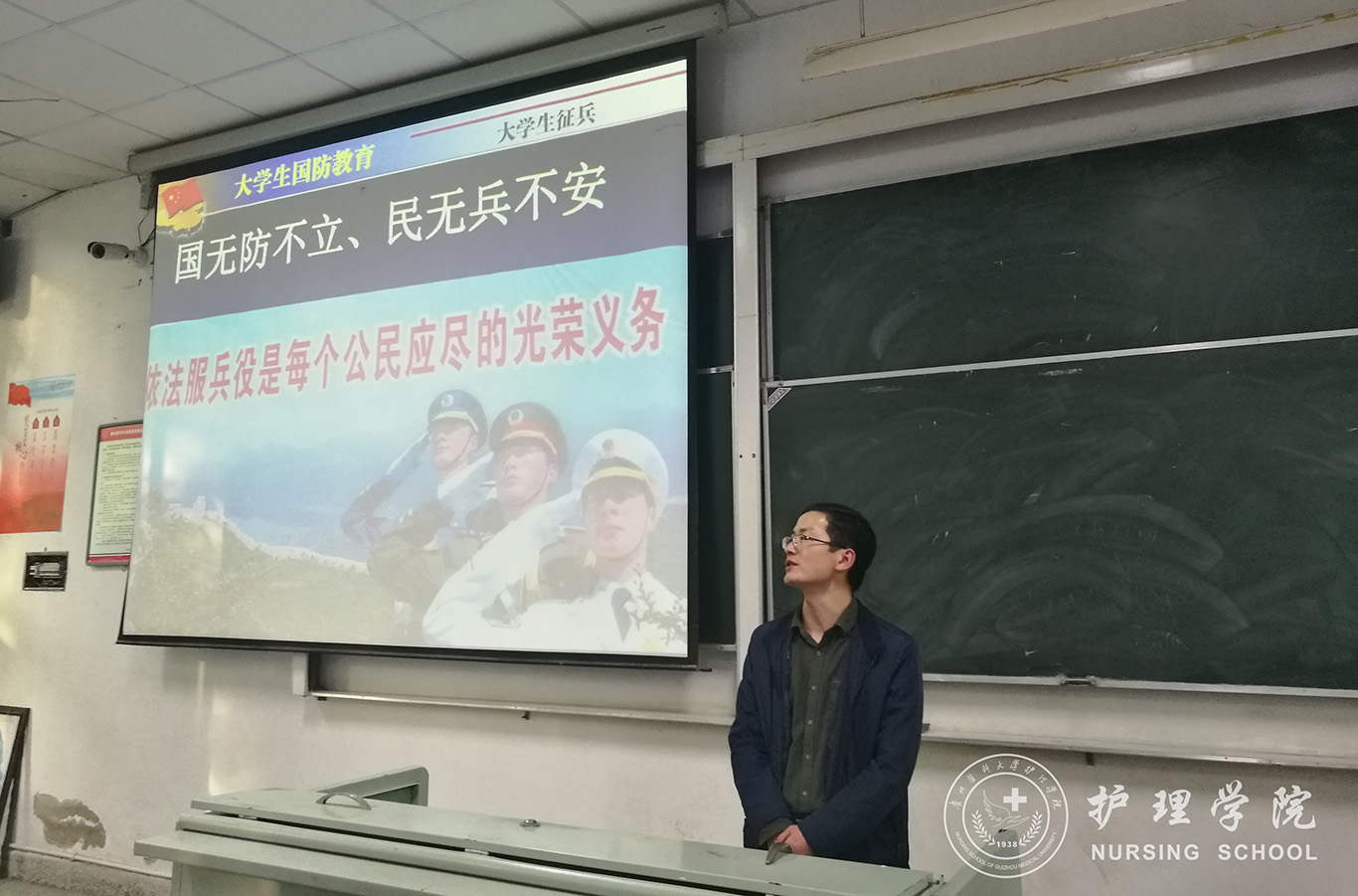 马景瑶首先通过建军70周年阅兵式的视频,向同学们展示了训练有素、军事素质过硬的人民军队的威武英姿。接着介绍了习近平总书记给南开大学8名新入伍的老员工回信,信中总书记肯定了他们携笔从戎、报效国家的行为,勉励广大青年把热血挥洒在实现强军梦的伟大实践之中,书写绚烂、无悔的青春篇章。其次从“保家卫国、建功立业,促进就业、丰富人生,历练自己、打下基础”等方面强调了应征入伍对于老员工的意义,向同学们讲解了老员工应征入伍的优惠政策、应征条件和多种益处。