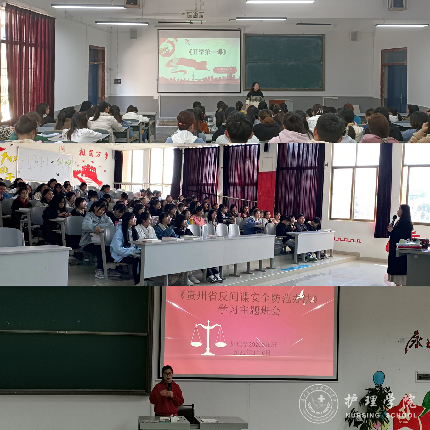班会中,辅导员组织同学们学习了《国务院关于支持贵州在新时代西部大开发上闯新路的意见》(国发〔2022〕2号)文件精神,并结合贵州教育大讲堂2022年春季学期开学第一课内容,引导同学们抓住贵州发展的机遇,不断扎实提高自己的专业能力,在新时代新征程中奋勇前行,贡献青春力量。同时各辅导员对班级上学期的学习情况进行了总结,从新学期开学纪律要求、疫情防控相关政策、安全教育以及学业规划等方面对同学们进行了叮嘱,鼓励同学们要进一步端正学习态度,提升自我管理能力。毕业班辅导员则重点从实习管理、研究生复试、护士执业资格考试、毕业考试等方面的情况,进行详细讲解并提出相关纪律要求,鼓励同学们平衡好实习、毕业与就业三者的关系,克服困难,顺利完成实习并尽早实现就业。