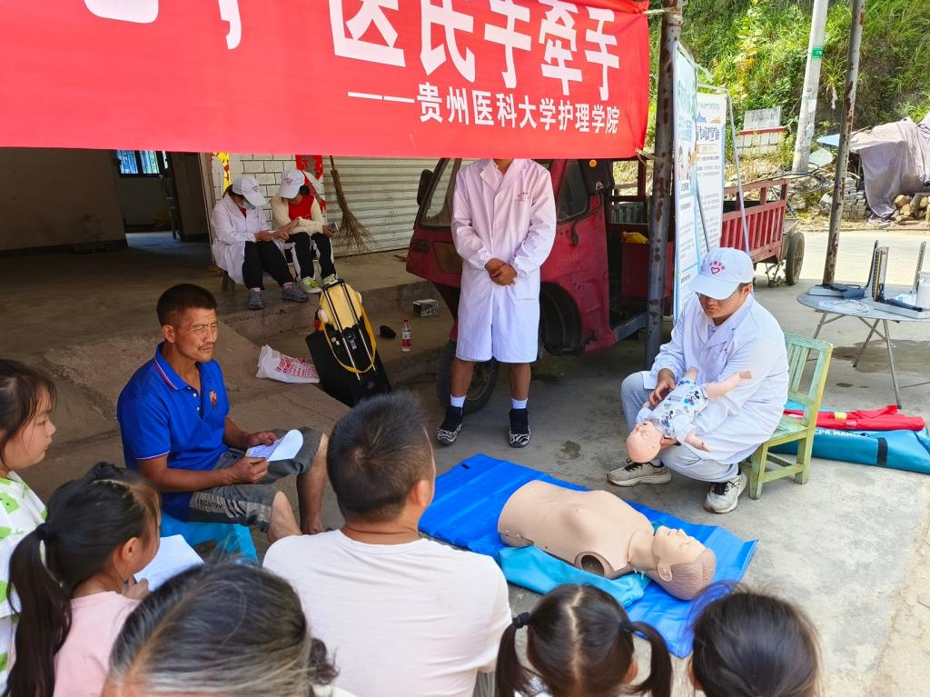 活动过程中,志愿队分为三组前往10位孤寡老人家中进行了慰问,队员们给孤寡老人送去了爱心物资和温暖的问候,并为老人测量血压,进行了用药指导;接着,志愿者们在村里开展了健康义诊、关爱留守儿童、急救知识培训和溺水宣讲,通过一系列急救知识的讲解提高了村民们的急救技能,志愿者耐心的陪伴留守儿童,让他们感受到了来自贵医学子的关怀和温暖。