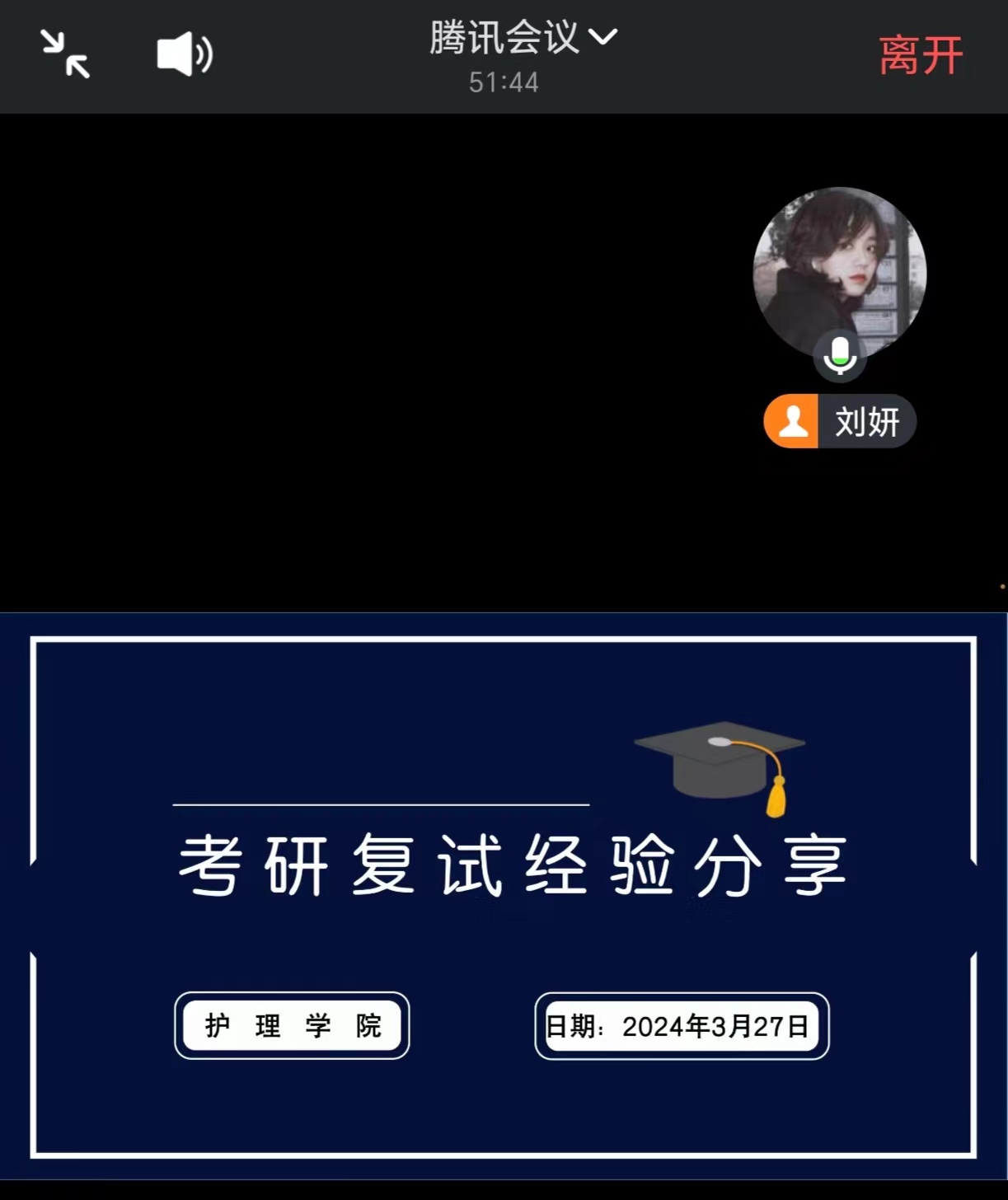 首先,刘妍介绍了今年公司毕业生考研的整体状况,对参会进行交流的在读研究生进行了简要的介绍。接下来,遵义医科大学在读研究生陈悦、李珊和刘凌扬依次交流发言,她们从遵医研究生复试的程序、注意事项以及技能操作等方面作了详细讲解和分享。伟德官网bv1946在读研究生李江燕则重点从复试礼仪、语言表达、答题技巧等方面对贵医考研复试进行了全面的讲解。毕业班辅导员毕丽鼓励进入研究生复试的同学要树立信心,戒骄戒躁,以最佳的精神面貌迎接复试,坚持不断学习以提升自身的综合素质。