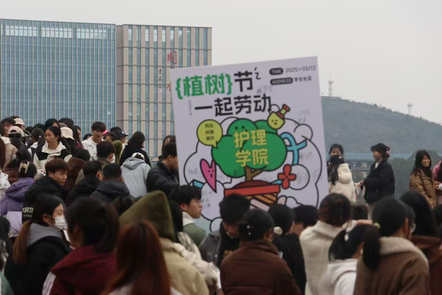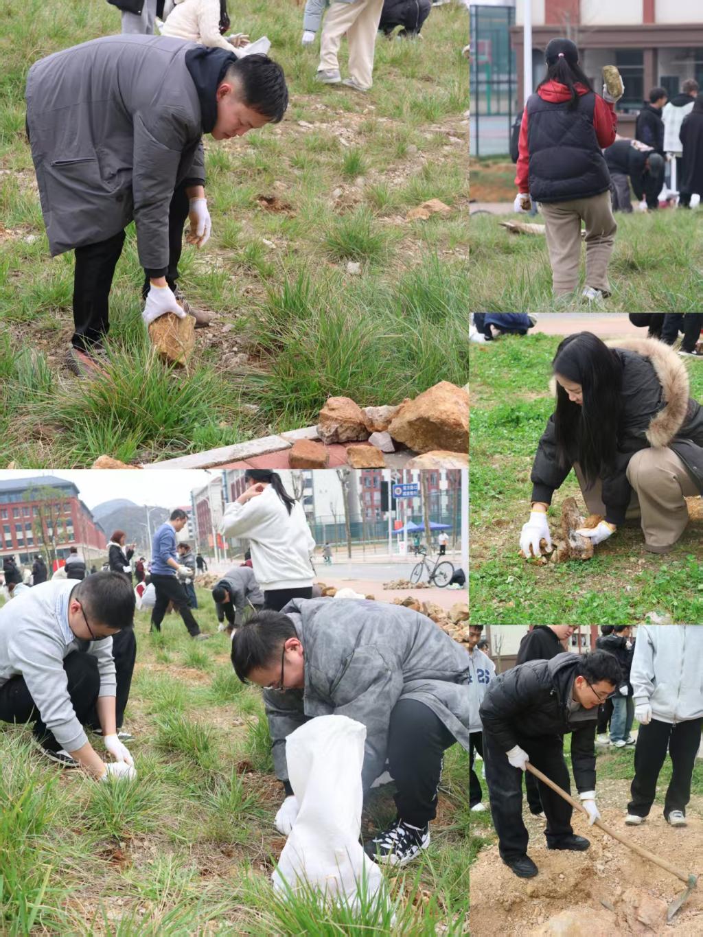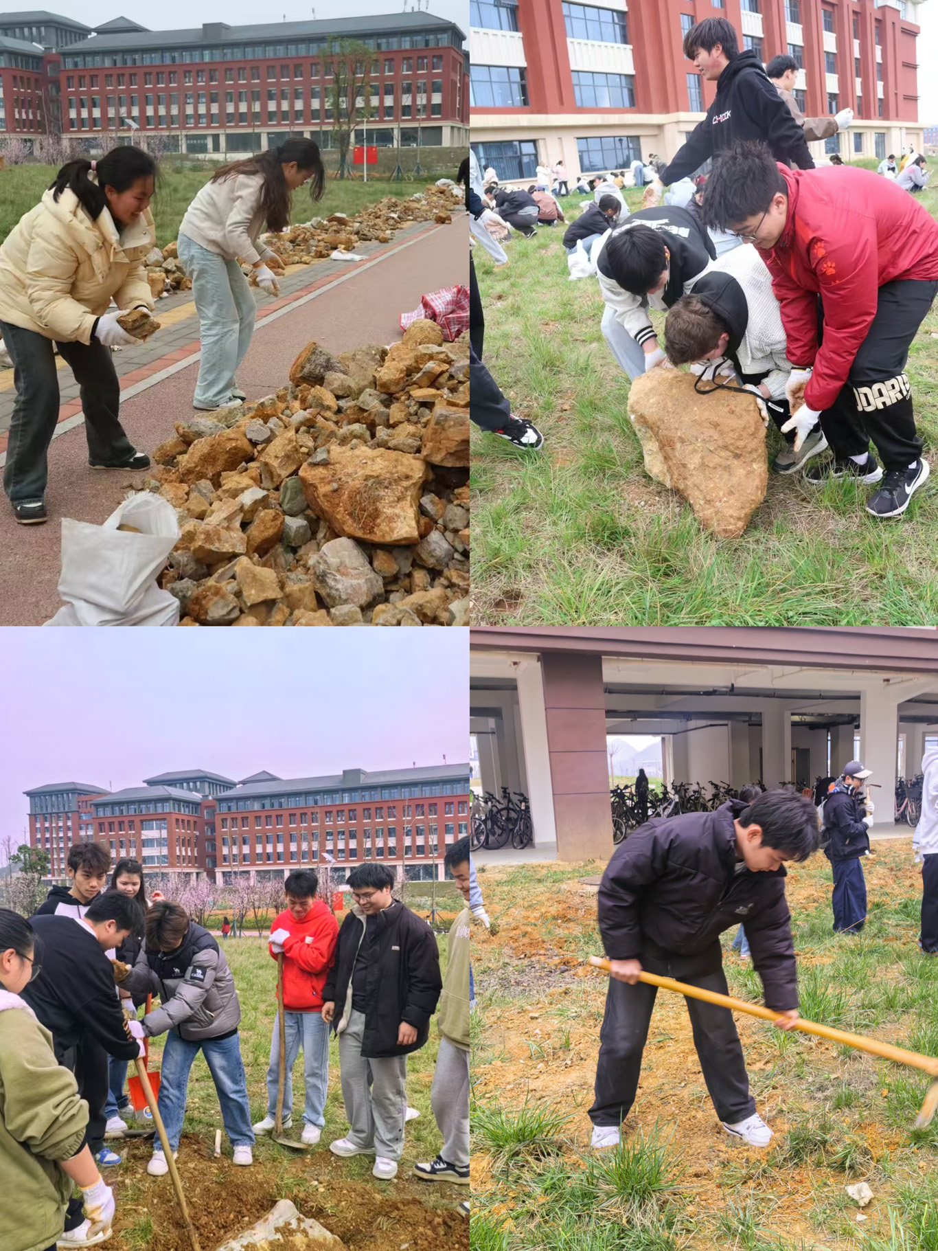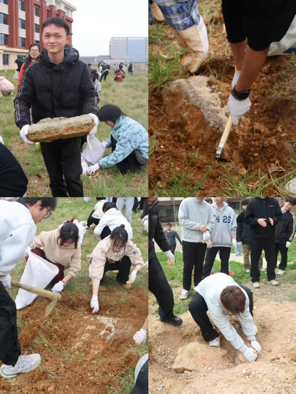 活动开始前,何为为本次活动致词,他强调护理人不仅要在病房守护生命健康,也要用行动守护地球的生命线。同学们捡起的每一块石头,都是对校园土地的呵护。当我们俯身拾起散落的石块,不仅消除了安全隐患,更让草坪重获生长的空间,让林荫小道更加平整洁净。这举手之劳,正是对"校园是我家"理念的真诚践行。致词结束后,在场师生们热情高涨,迫不及待挥起铁锹、提起簸箕,开启“绿色行动”!同学们化身“园艺能手”,挥动铁锹翻松土壤,细心捡拾石块杂物,齐心协力将一块块石头从草坪上清理出去。劳动现场,大家干劲十足,分工明确,有的三五成群,边劳动边商量如何处理草坪里扎根的大石头,有的负责捡石头,有的则负责将石头装袋运到路边整齐堆放。