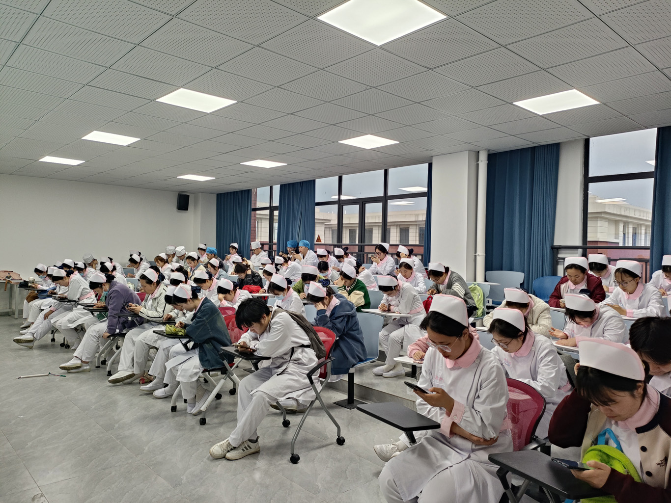 活动采用"理论考核+技能操作"的选拔模式分三阶段进行:第一阶段为专业理论笔试,在标准化考场环境下,参赛选手沉着应答,最终108名选手凭借扎实的理论基础成功晋级;第二阶段开展心肺复苏(CPR)技能考核,选手们规范完成意识判断、胸外按压、人工呼吸等操作流程,72名操作娴熟、表现优异的选手进入下一环节;第三阶段进行临床技能综合考核,通过随机分配肌内注射或皮内注射操作项目,全面考察选手的临床思维与操作能力。评委团队严格依据评分标准,对选手的操作规范性、流程完整性及人文关怀等方面进行综合评价,最终选出了36名优秀选手进入接下来的比赛阶段。