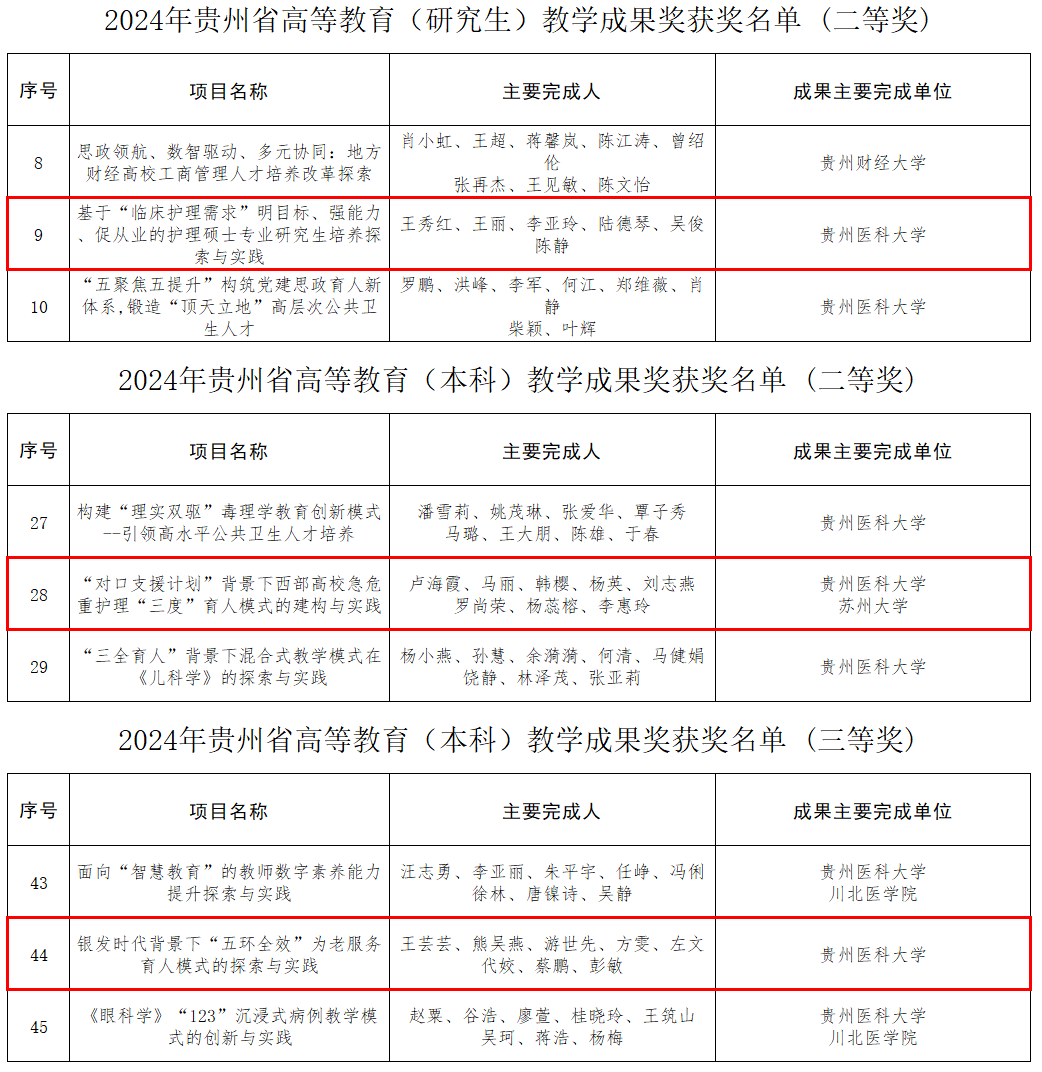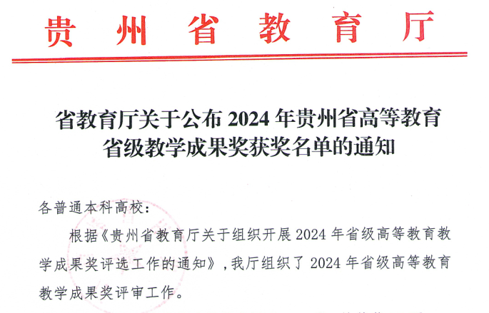 近日,贵州省教育厅公布了2024年贵州省高等教育省级教学成果奖获奖名单,bevictor伟德官网在此次评选中收获颇丰,共有三个团队获奖,其中研究生组二等奖一项、本科组二等奖一项以及本科组三等奖一项,这一荣誉充分展现了公司在公司产品改革、人才培养模式创新等方面的显著成效。