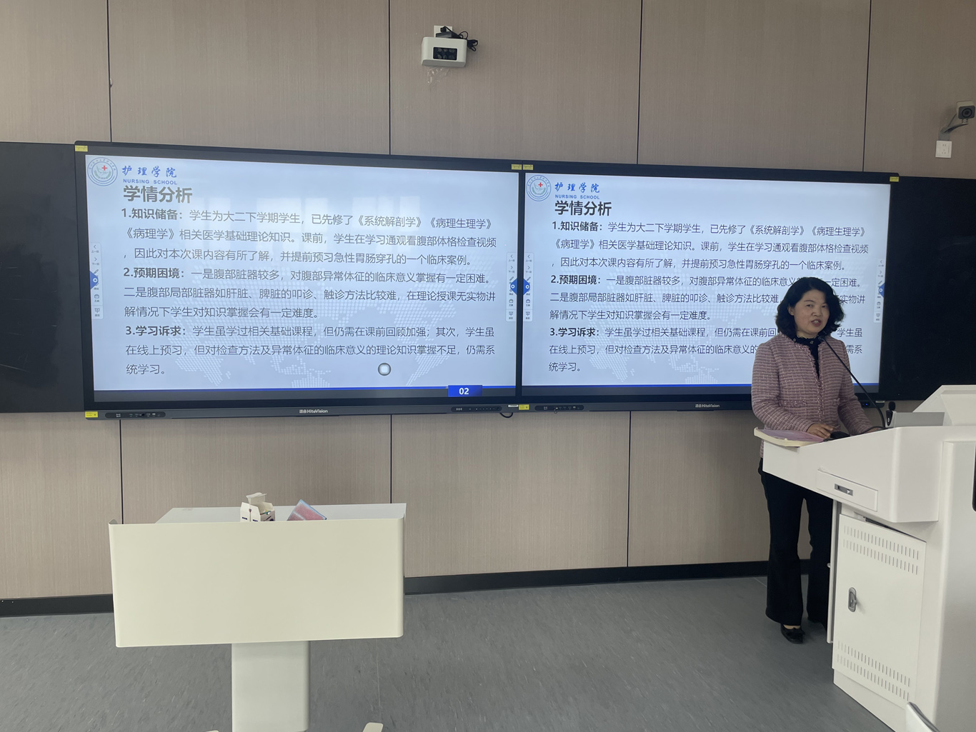 活动伊始,主持人晏家芳老师强调了《健康评估》课程在护理学专业中的重要地位,指出腹部体格检查作为该课程的核心内容之一,对培养员工专业知识和临床技能具有关键作用。随后,主备课人刘志燕老师围绕“腹部体格检查”展开详细阐述。她从教学目标、教学重、难点、教学方法、教学过程设计等方面进行了深入讲解,分享了自己在备课过程中对教材的理解和把握,以及如何将理论知识与临床实践相结合,引导员工掌握腹部体格检查的理论知识和规范操作流程。