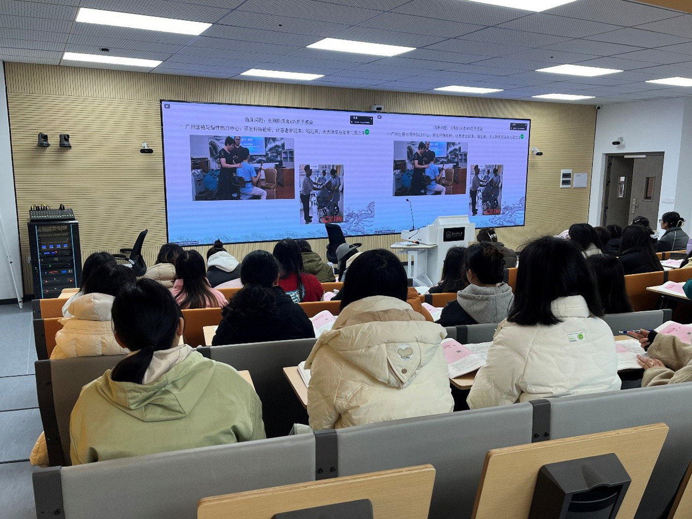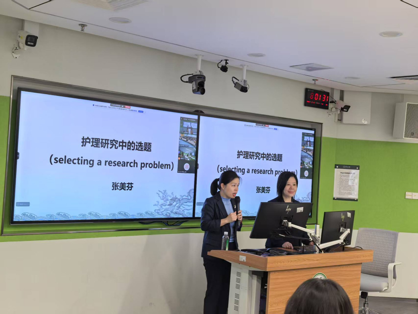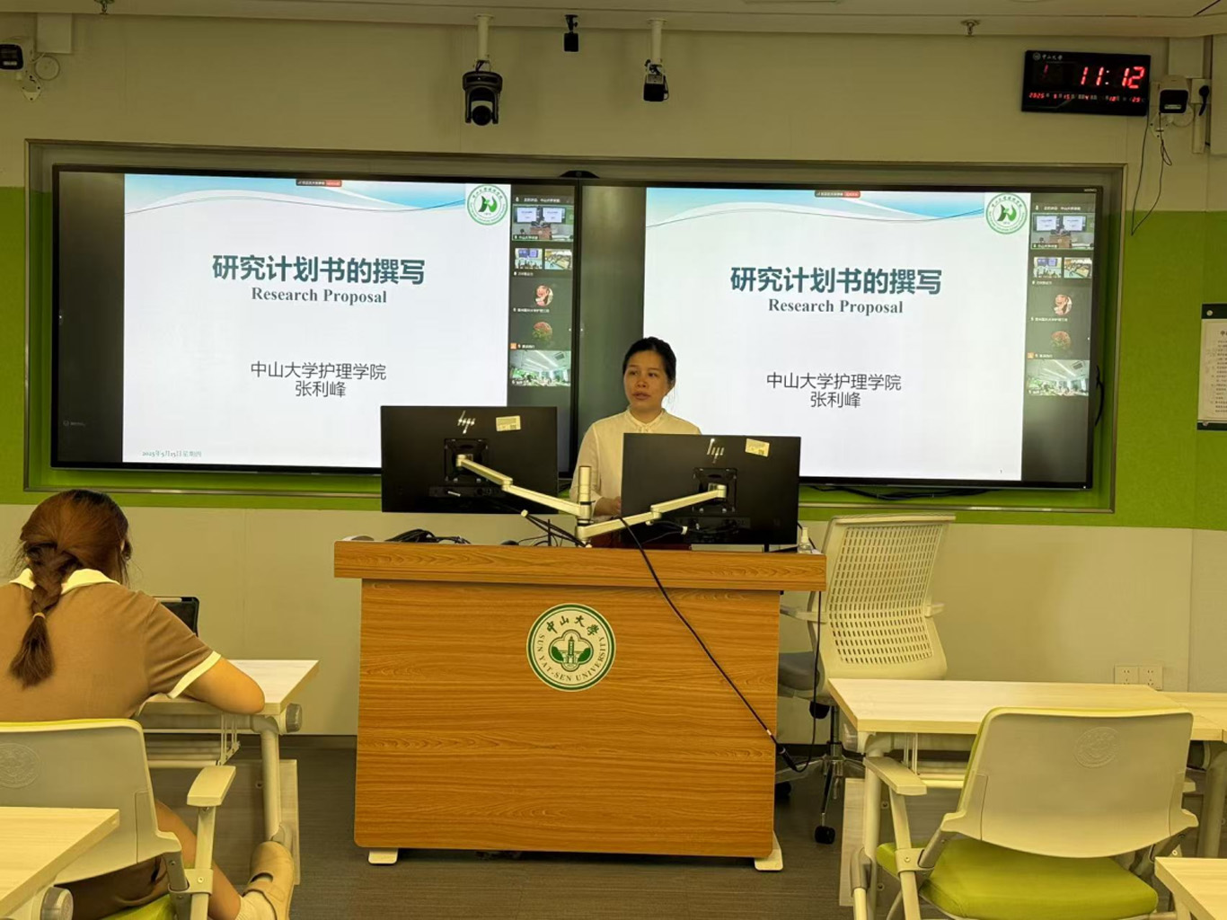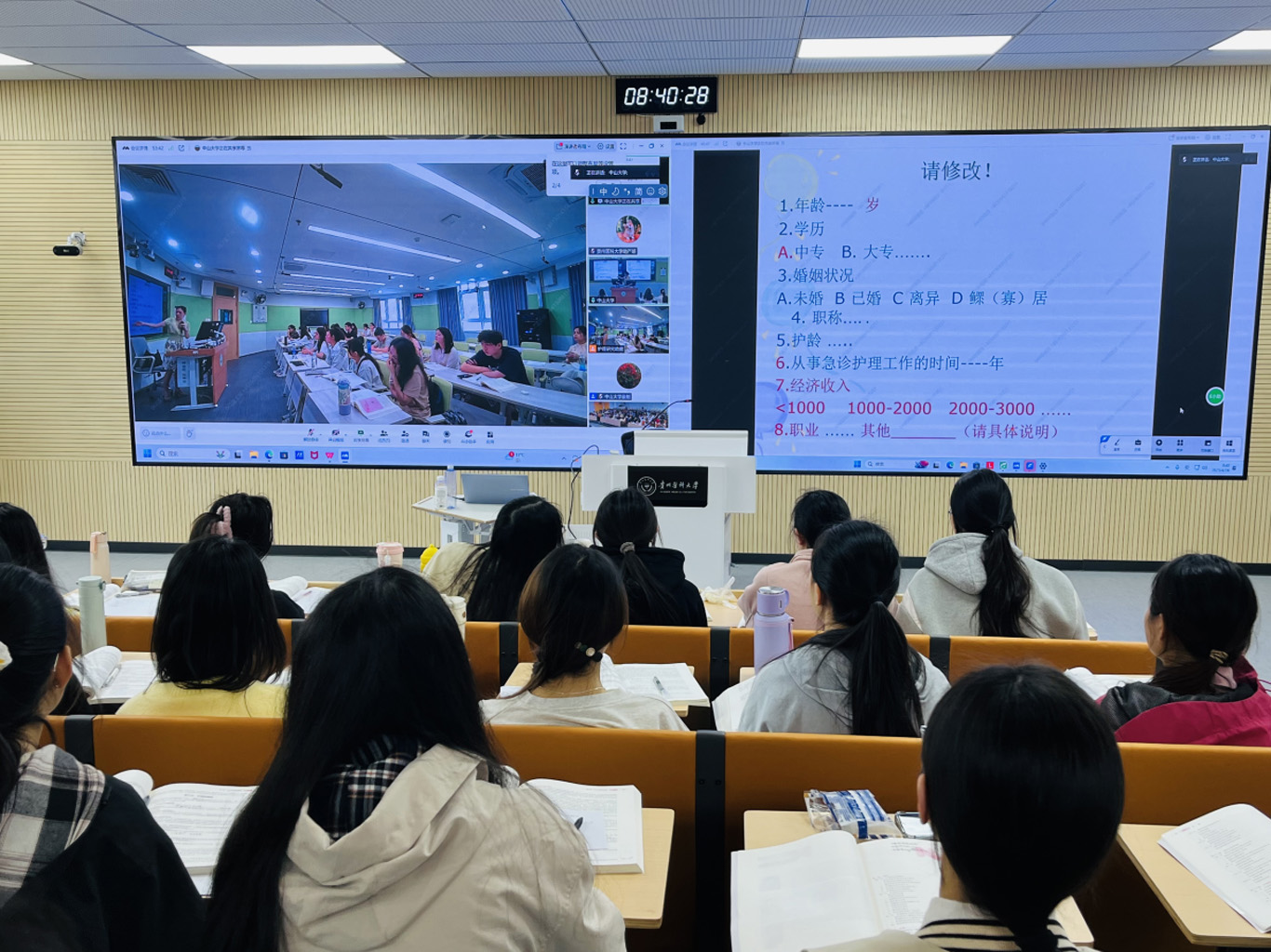 此次活动中中山大学张美芬教授、刘可副教授、张利峰副教授分别就“护理研究选题”“资料收集法”“研究报告的书写”,同步为中山大学2023级22名同学和2022级152名进行授课。伟德官网bv1946护理学基础教研室副主任邹惠美及护理学研究教学团队教师冯安丽、卓英权老师作为主要参与教师共同协助同步课堂的开展。