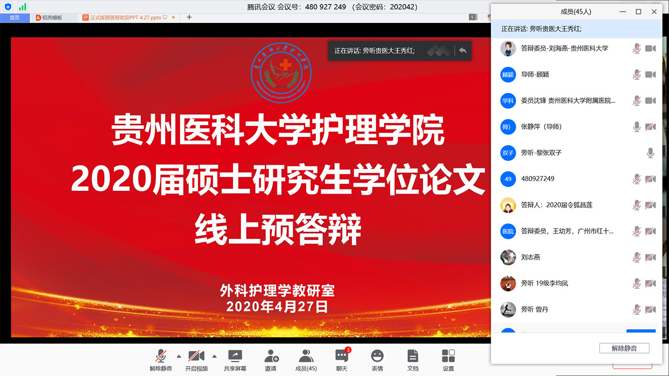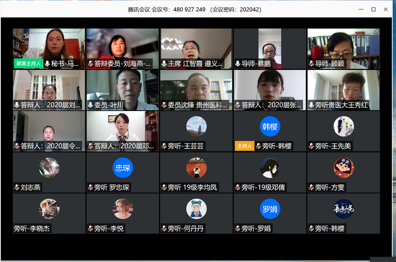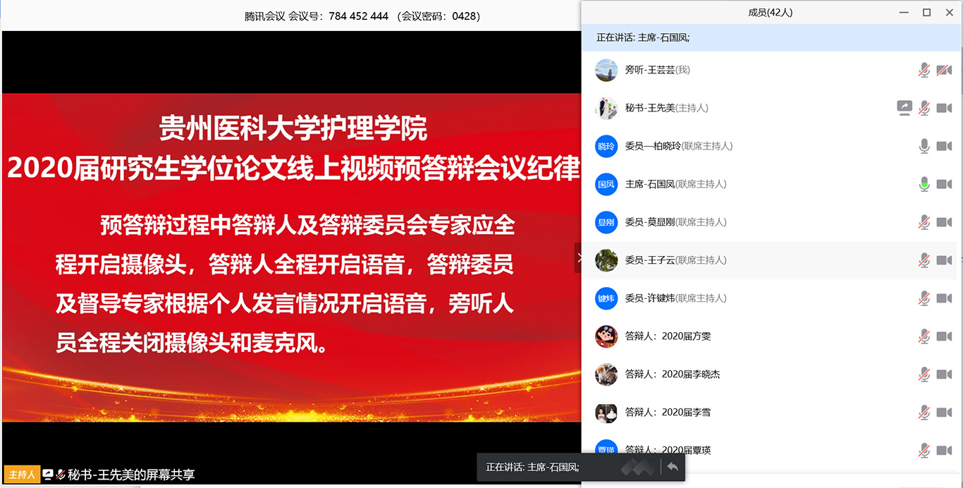 此次线上预答辩采用腾讯会议平台,8名毕业班研究生同学按研究方向分成两组进行。答辩委员会主席和委员分别由贵州中医药大学bevictor伟德官网党委书记石国凤教授、遵义医科大学bevictor伟德官网经理江智霞教授、贵州省人民医院柏晓玲博士、伟德官网bv1946附属医院ICU主任沈锋博士、骨科博士后叶川教授、老年医学科教授莫显刚博士、广州红十字会医院王幼芳副主任护师、伟德官网bv1946公共卫生公司王子云博士、刘海燕副教授、伟德官网bv1946基础医公司许健炜博士担任。两场预答辩共有近100人参加,公司研究生教育督导专家、bevictor伟德官网及附院导师、专业教师和全体研究生同学参加预答辩旁听。