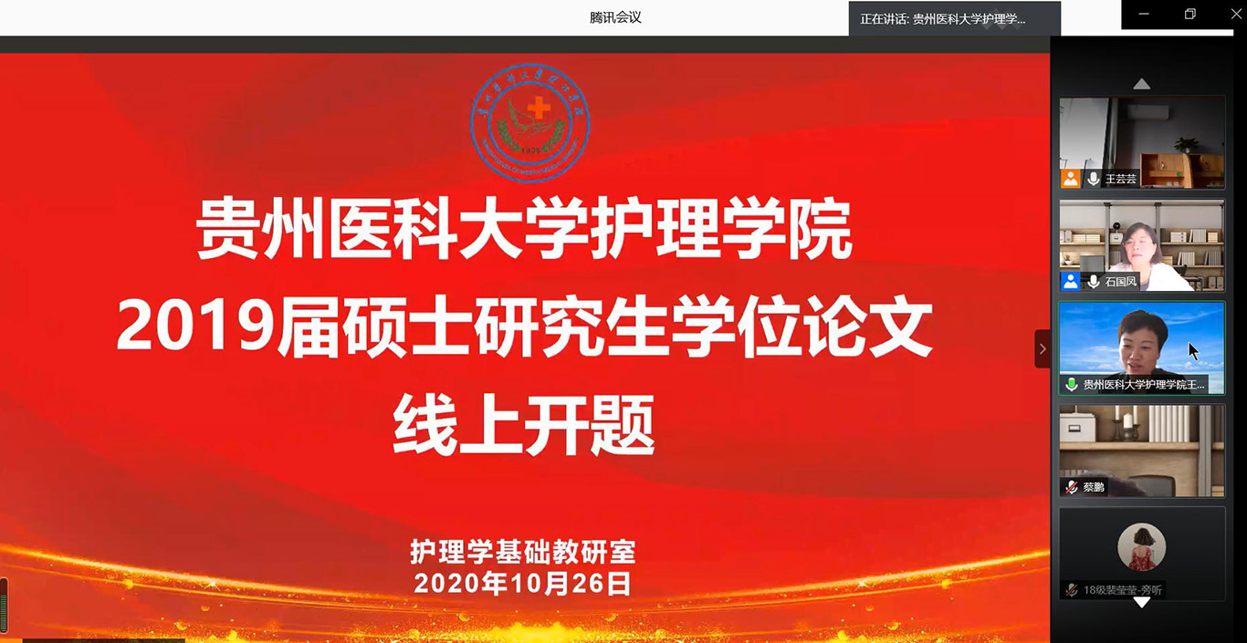 10月26日-27日,2019级硕士研究生第一批集中开题通过腾讯会议平台在线进行,护理学基础教研室3名研究生和外科护理学教研室4名研究生