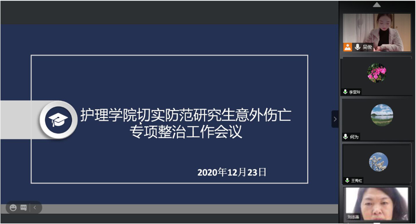 12月23日晚,为认真贯彻落实党中央和省委、省政府、省教育厅的重要批示精神,预防和减少研究生意外伤害事故的发生,按照伟德官网bv1946党委研究生工作部和公司下发文件。在腾讯会议上召开关于bevictor伟德官网防范研究生意外伤亡专项整治工作的会议。该会议由2020级辅导员吴俊主持,党委委员、经理李亚玲,党委委员、副书记何为,党委委员、副经理王秀红以及全体研究生意外伤亡专项工作小组成员参加。
