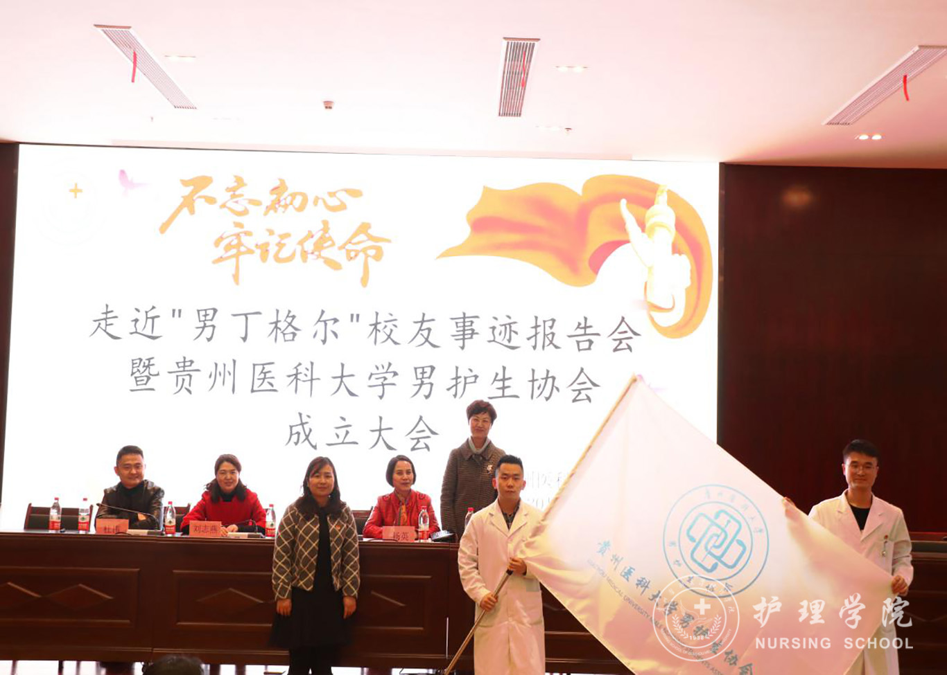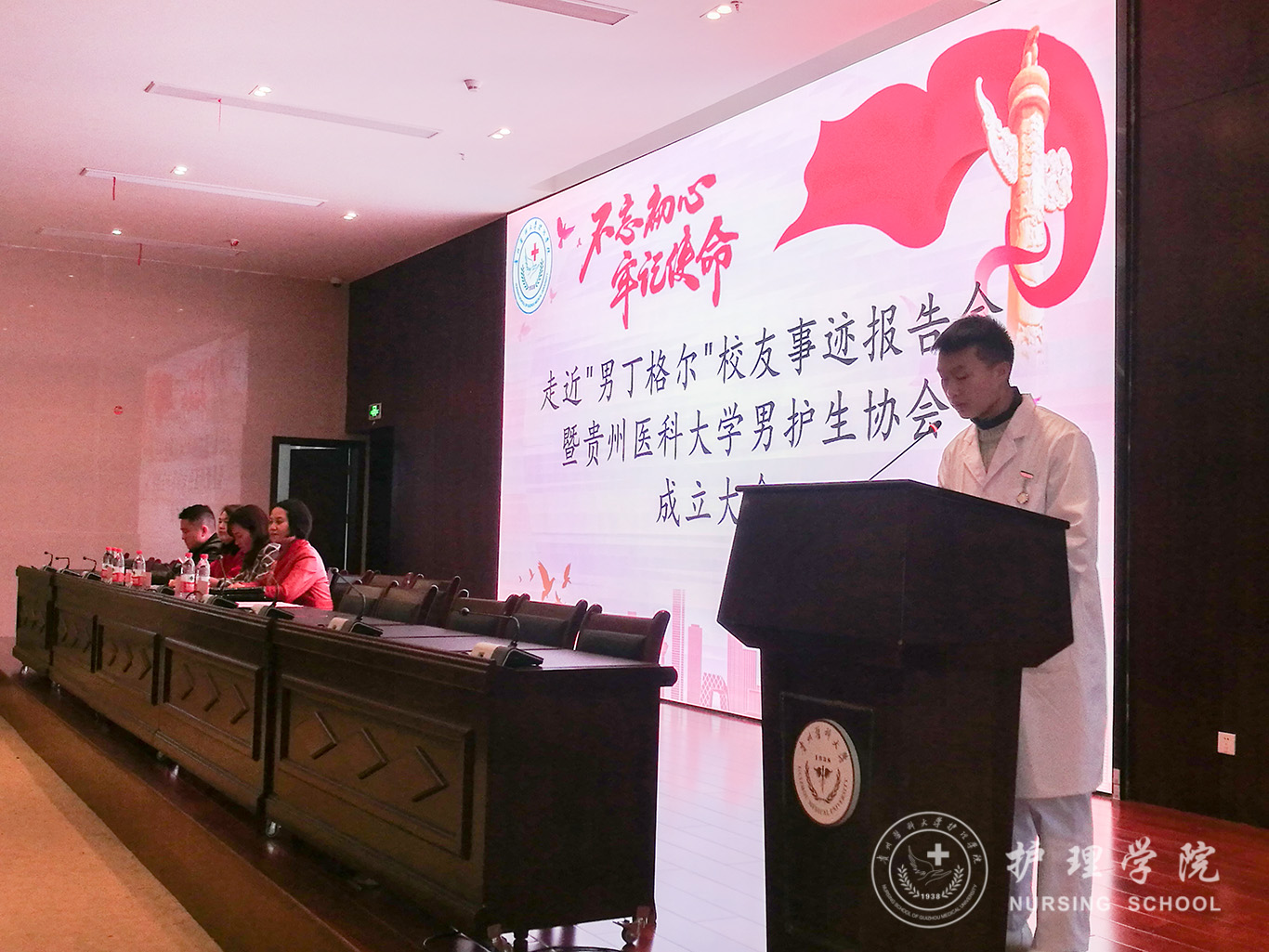 为进一步提升男护生的专业认知和学习兴趣,为男护生提供一个更广阔的学习交流和提升的平台,更好地帮助同学们做好职业生涯规划、坚定专业思想,并以此平台展示贵医男护生形象,让社会更多地了解男护生、了解护理,真正实现“无性别差异的护理”。bevictor伟德官网于2019年12月17日下午在南校区道德讲堂召开“不忘初心、牢记使命”走进“男”丁格尔员工事迹报告会暨伟德官网bv1946男护生协会成立大会。校团委副书记(正处级)桂晓玲、bevictor伟德官网党委书记杨英、党委副书记王秀红、副经理刘志燕、员工贵州省人民医院急诊留观输液中心护士长杜伟、bevictor伟德官网教师、男护生协会成员及各班员工代表参加大会,大会由王秀红主持。