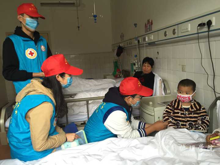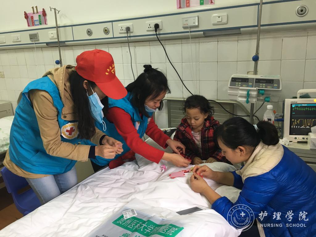 活动开展前,志愿者代表就联系贵医附院血液科儿童病房金主任确定探望时间,邀请青年志愿者协会负责人对成员进行血液病知识培训,了解进入病房的注意事项,并准备活动物资。活动开展中,志愿者分成4个小组进入不同的病房,开展绘画,写字,唱歌等小活动,利用发放奖品的方式与孩子们进行互动,并穿上卡通人偶的服装,拉近与孩子们的距离。随后,志愿者们演奏吹笛子,举行折纸比赛,开展趣味问答,调动了病房孩子们的积极性,转移治疗中对疼痛的注意力。志愿者在服务过程中,与孩子们打成一片,看着与病魔斗争中依旧纯真善良的笑容,更加坚定了将来用所学医疗知识服务社会、服务人民的信念。活动结束后,志愿者们合影留念。