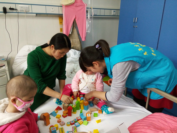 上午,各公司及青协负责人进行书籍与玩具的采购。下午3:00,活动正式开始,本次活动由附院血液病儿科病房主任金姣主持。首先,金主任向孩子们介绍了本次活动的流程。紧接着,节目组的成员为小朋友们表演了《小苹果》等节目,孩子们的脸上洋溢着笑容,欢呼声与掌声似乎已让孩子们忘记了疼痛。之后,参与活动的全体成员将采购的书籍与玩具分发到每一间病房并和孩子们一起学习、玩耍。病房里,走廊里,充满了孩子们的欢声笑语。大家的到来无疑为他们简单的生活增添了许多色彩。