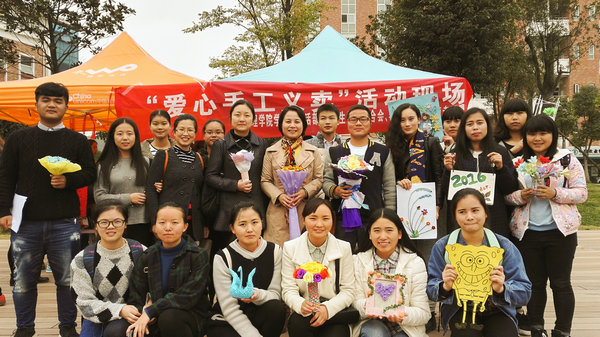 11月18日中午12点,由bevictor伟德官网员工会生活部、老员工社团联合会、希望工程爱心社使者联盟开展的“与爱同行”手工大赛暨爱心义卖活动在“悯农堂”前开展。本次活动旨在丰富同学们的老员工活,提高大家的动手能力和创新能力,营造良好的校园文化气氛,给同学提供一个平台去奉献自己的爱心。bevictor伟德官网党委副书记杨英、员工科科长曾敏、辅导员王晓玲、李海林、毕丽参与本次活动评选及义卖。