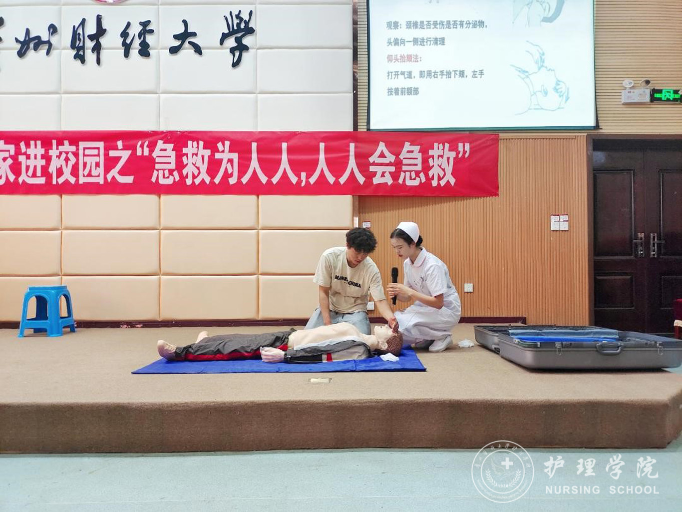 本次培训以“理论讲解+现场演示+实践操作”相结合的形式进行。首先,田晶结合PPT讲授了心肺复苏的重要步骤和要点,张仁莉介绍了海姆克立急救法。随后,在两位老师的指导下,护理技能协会技训部黄盈盈、朱大龙两位同学分别用模型对各环节的操作流程和要领进行同步演练。最后,参加培训的学员上台参与实践操作练习,相互交流学习心得体会。