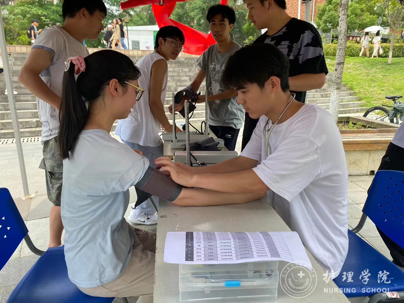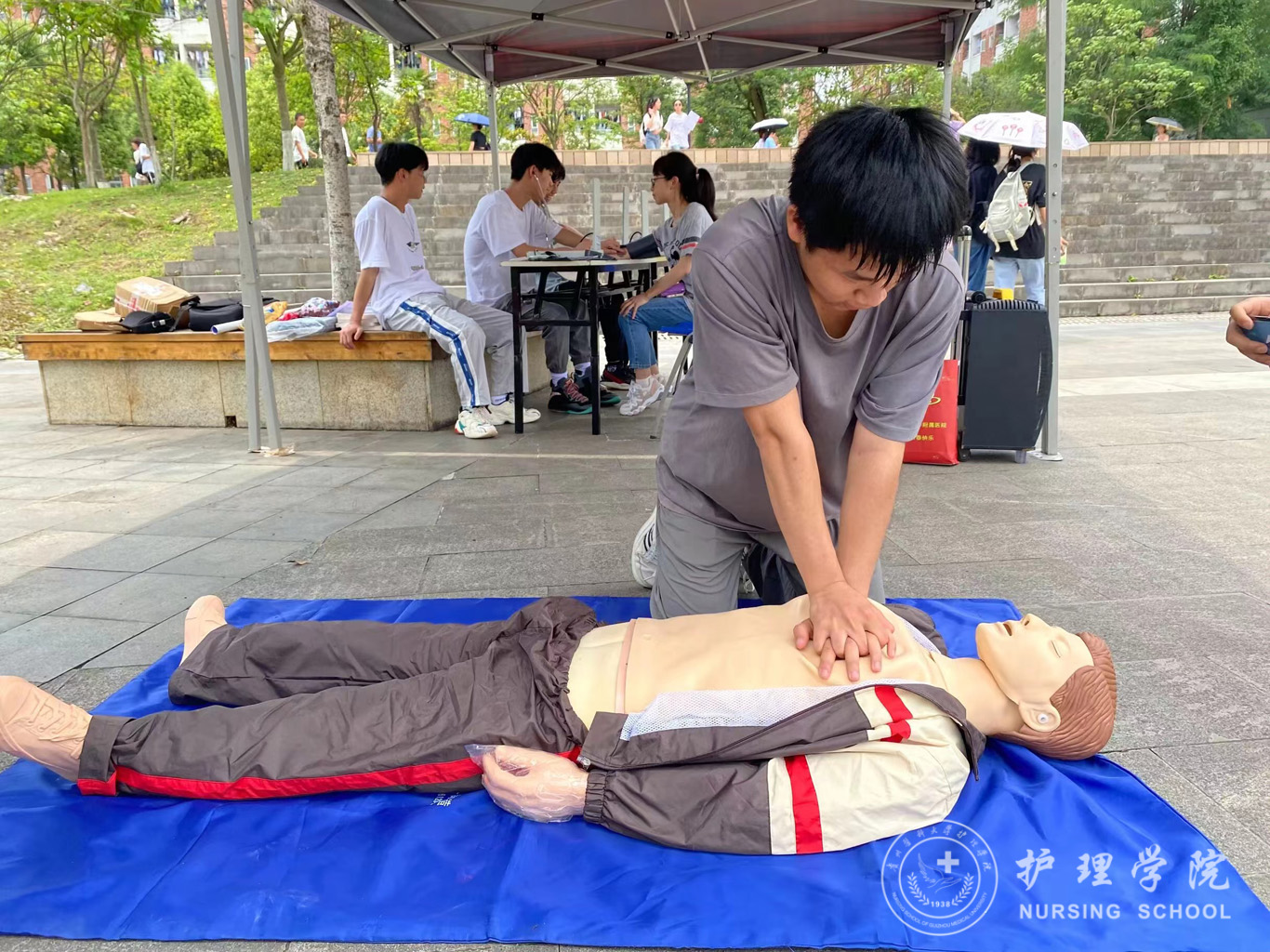 活动以健康宣教、现场演练、知识问答等多种方式进行。活动过程中,男护生协会成员为参与活动的同学测量血压并进行健康宣教。同时由护理技能协会成员为同学们集中展示了心肺复苏法(CPR),通过现场演练生动形象地介绍心脏骤停的原因及倒地患者是否需要实施急救的快速判断方法,详细地演示了成人实施心肺复苏技术的流程、方法及注意事项等。最后还组织进行了急救知识答题,以知识问答的形式帮助参与同学熟悉急救知识、了解急救理论。