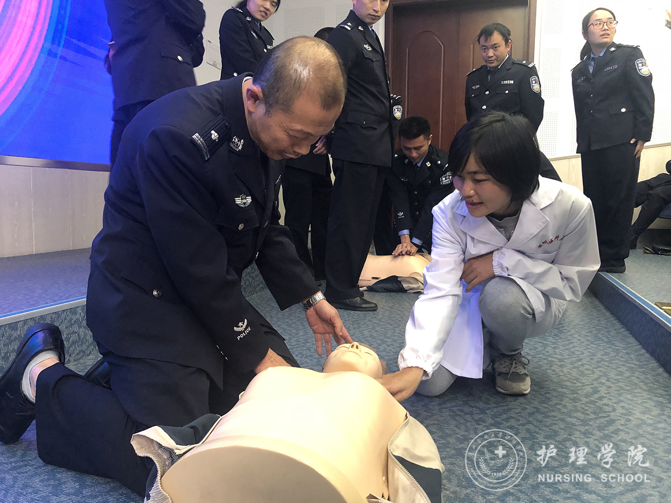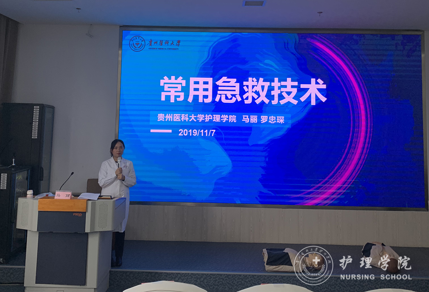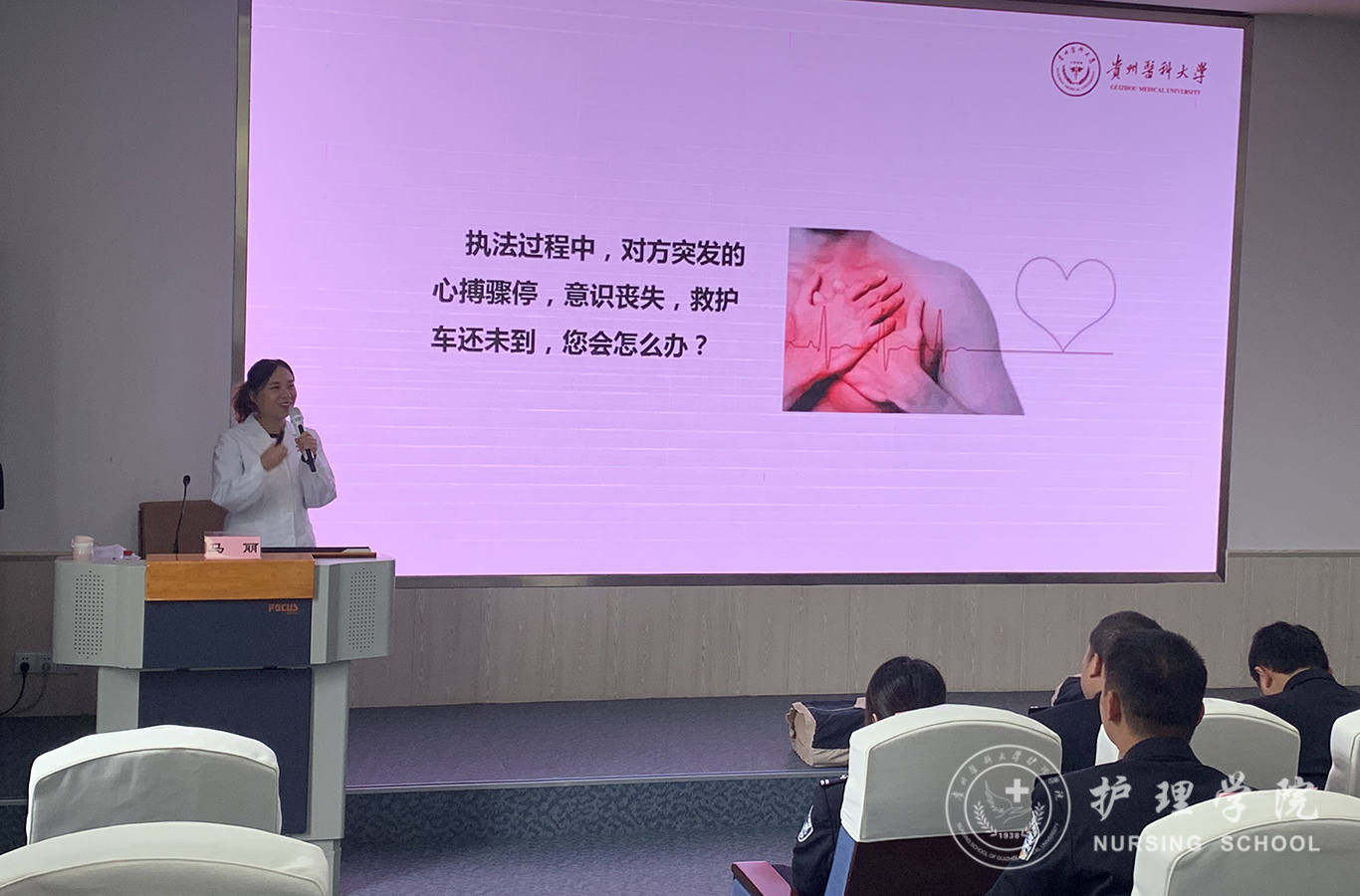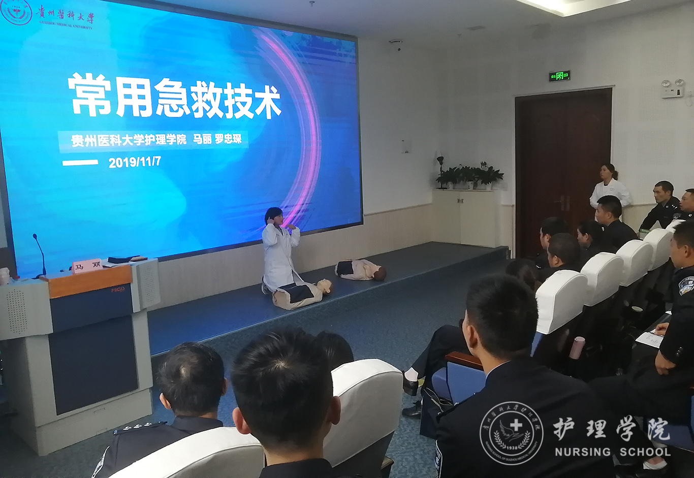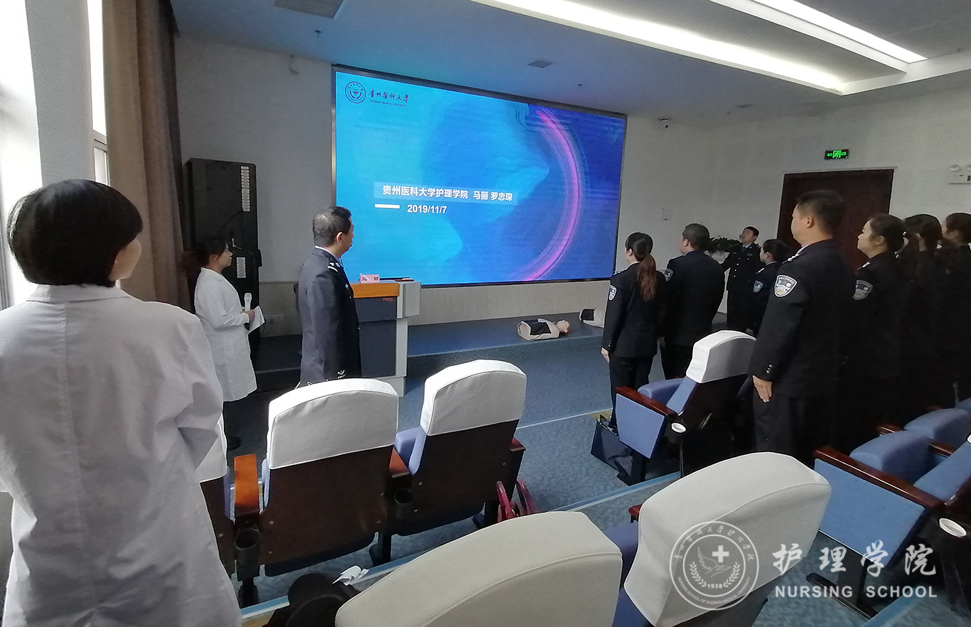 受贵州省人民检察院法警总队邀请,中国南丁格尔志愿护理服务队伟德官网bv1946分队志愿者、bevictor伟德官网外科护理学教研室教师马丽和罗忠琛于11月7日到观山湖区国家检察官公司贵州分院为“2019年贵州省检察机关新入警及晋升警衔司法警察培训班暨支队长硏讨班”授课,培训学员共55人,培训内容为常用急救技术。