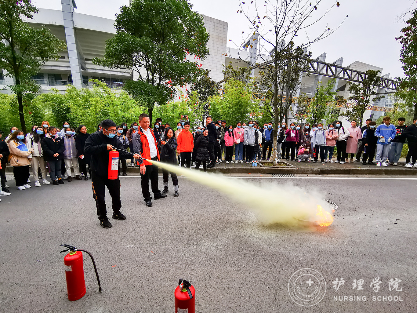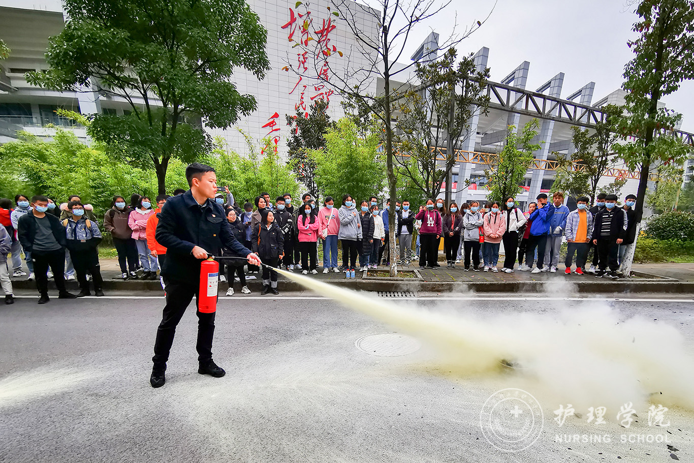 汪青松主任结合生动的案例、视频、图片,围绕“检查消除火灾隐患能力”、“组织扑救初期火灾能力”、“组织人员疏散逃生能力”三个内容进行了详细的讲解,并且开展了对灭火器使用方法的实操演练。通过汪主任深入详尽的讲解,使广大师生掌握到了科学实际的预防、灭火方法和逃生技能。