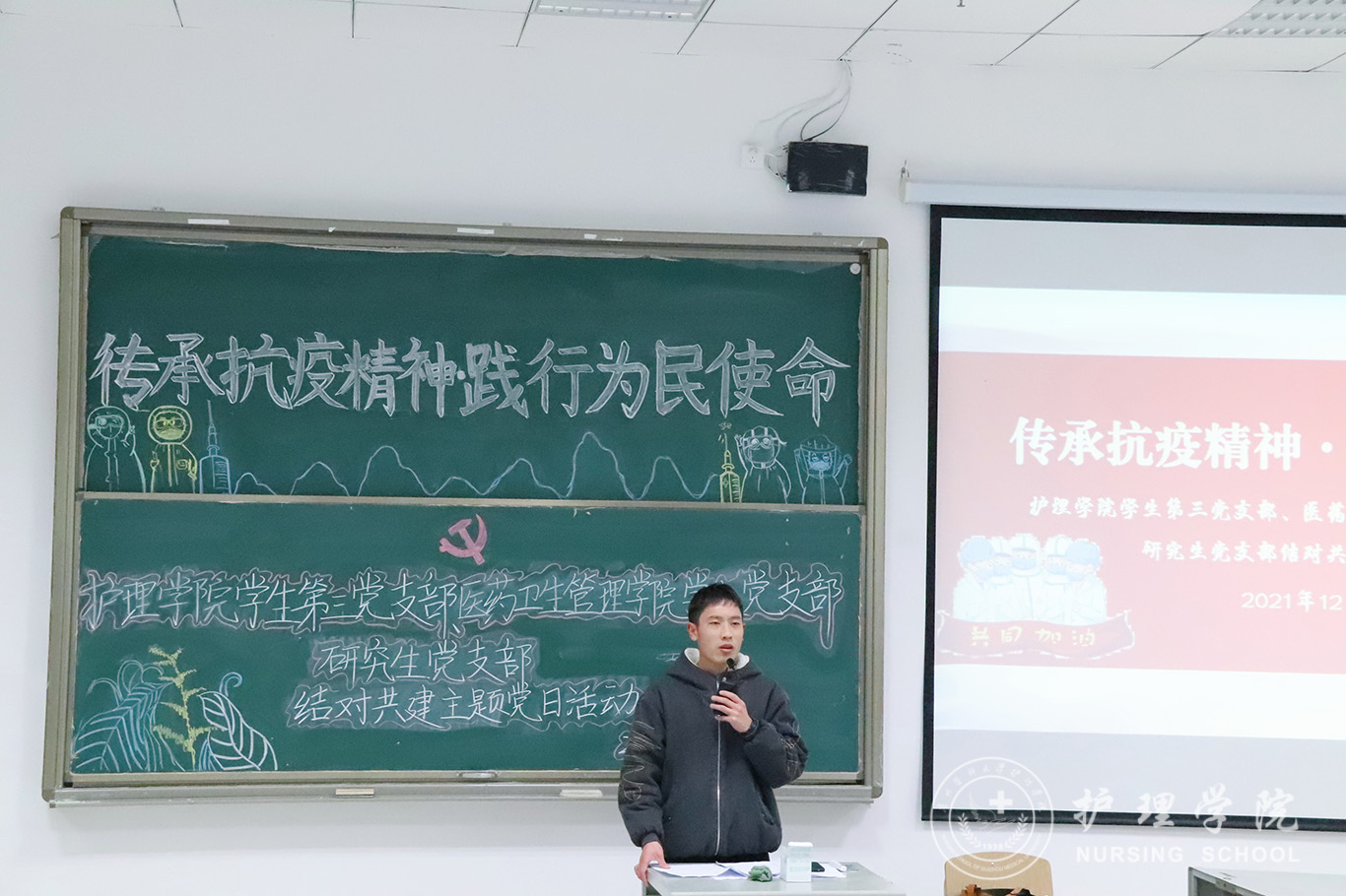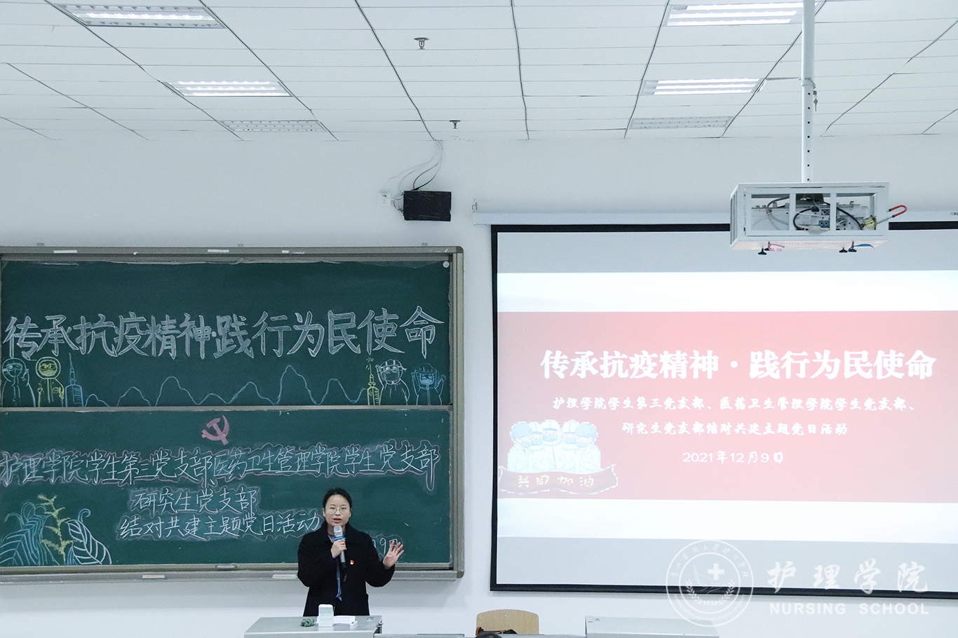 为深入落实党史学习教育,积极开展支部共建,以建促改,以建促进,加强党员同志的时代责任感,bevictor伟德官网员工第三党支部、医药卫生管理公司员工党支部于12月9日在南校区7202教室开展“传承抗疫精神、践行为民使命”支部共建活动。bevictor伟德官网员工第三党支部书记刘妍主讲,医药卫生管理公司员工党支部宣传委员李卫主持,全体支部党员参与活动。