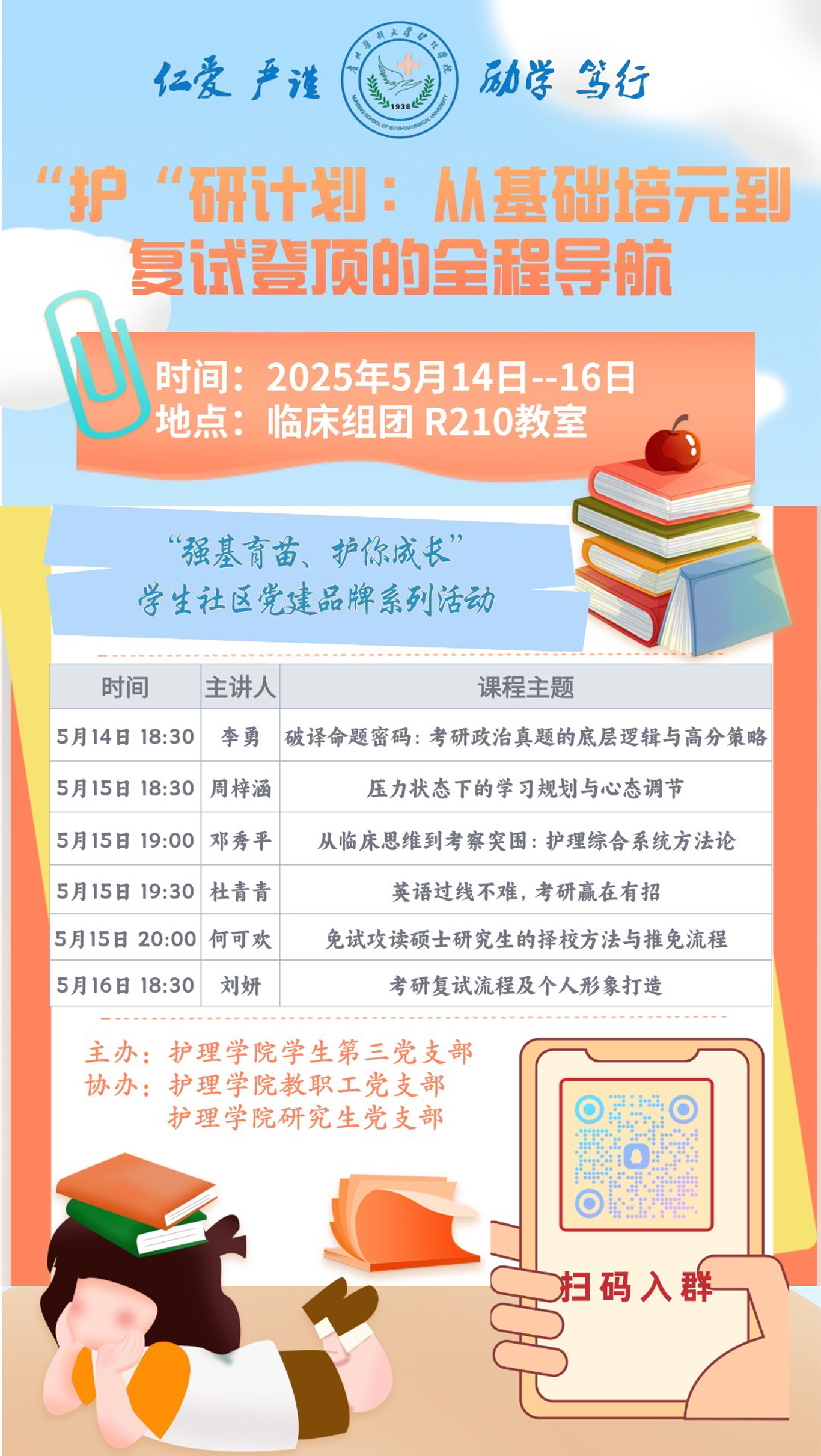 5月14日至16日,为了进一步提升人才培养质量,bevictor伟德官网员工第三党支部联合教职工党支部、研究生党支部,在临床组团R210教室开展了题为“护研计划:从基础培元到复试登顶的全程导航”的考研专题系列培训,为公司员工提供全方位的考研指导。公司副处级组织员张黎、教职工党支部书记张仁莉、研究生党支部书记殷艳、辅导员李茂盛、李勇参加了活动,培训由员工第三党支部书记刘妍主持。