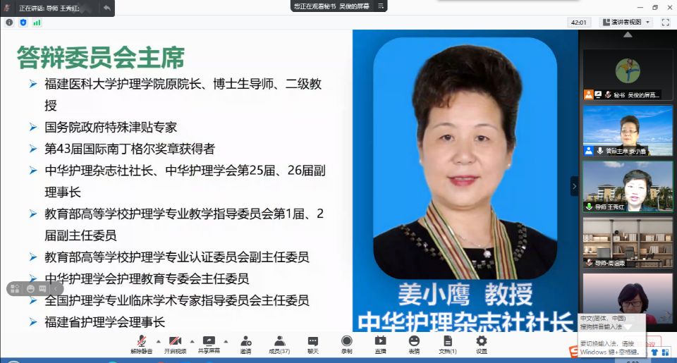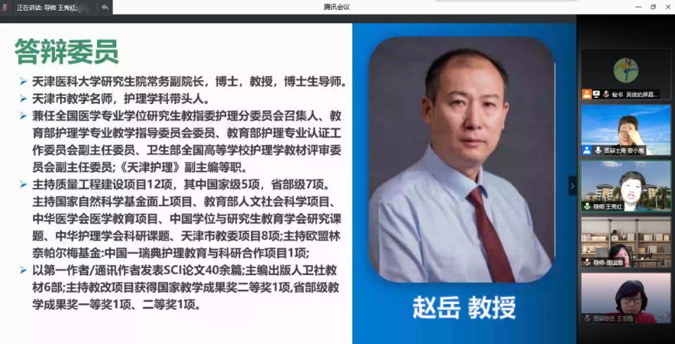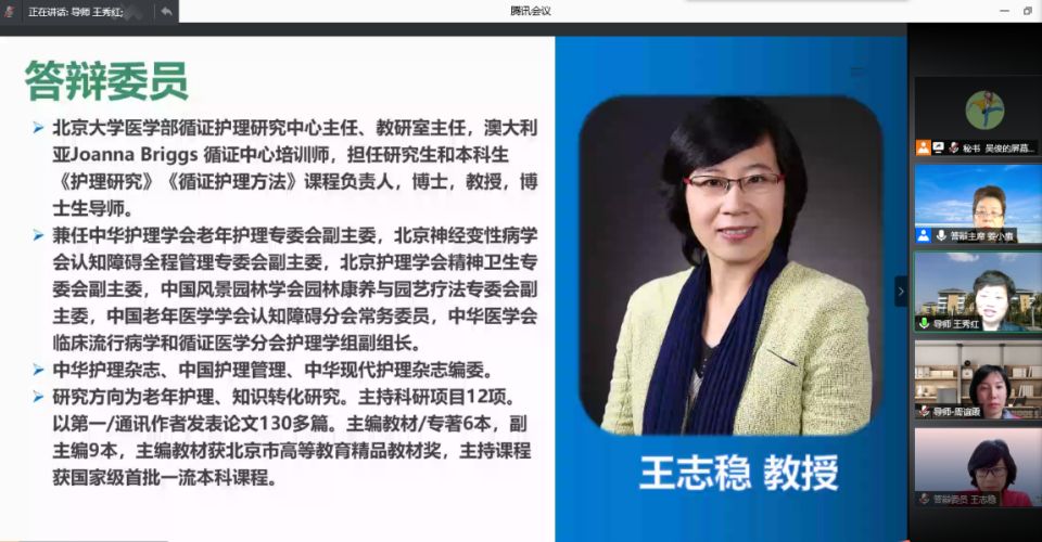 5月20日,2021届硕士研究生学位论文答辩通过腾讯会议在线进行。此次答辩特别邀请福建医科大学bevictor伟德官网原经理、中华护理杂志社社长姜小鹰教授任答辩委员会主席,天津医科大学研究生常务副经理赵岳教授、循证护理研究中心主任、教研室主任王志稳教授、基础医公司副经理舒莉萍教授以及伟德官网bv1946公共卫生公司汪俊华副教授担任答辩委员。bevictor伟德官网导师、副导师、专业教师、研究生等50余人参加本次会议,研究生院督导专家全程参与。