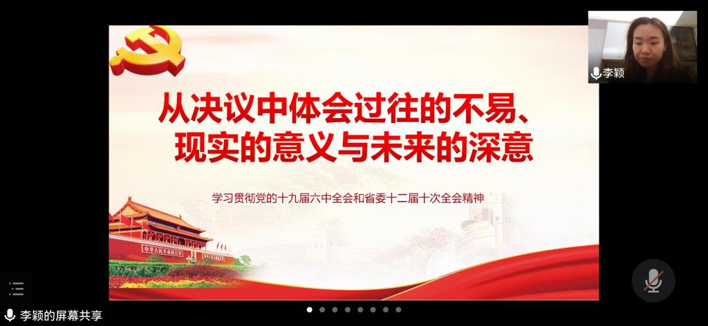 李颖围绕党的十九届六中全会精神和省委十二届十次全会精神,从过往的不易、现实的意义与未来的深意三个方面阐述了对《中共中央关于党的百年奋斗重大成就和历史经验的决议》的深刻体会,并带领支部党员认真学习了决议原文。李颖强调,生逢伟大时代,党员同学们要认真学习贯彻党的十九届六中全会精神和省委十二届十次全会精神,在各方面走在前,作表率,努力成为栋梁之才,为护理事业高质量发展贡献力量,做好新时代答卷人。