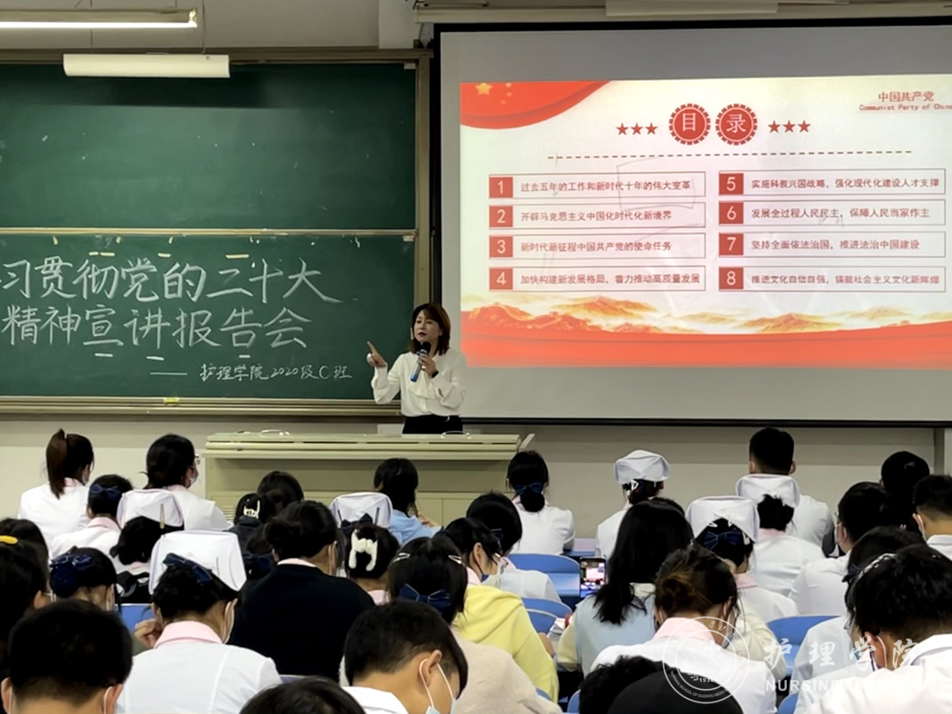 11月10日,为引导员工深刻领会把握党的二十大的重大意义、重大主题和重大成果,坚定不移衷心拥护“两个确立”、忠诚践行“两个维护”,bevictor伟德官网党委委员、副处级组织员张黎深入联系班级专题宣讲党的二十大精神,辅导员刘妍及护理学2020级C班全体员工参会。