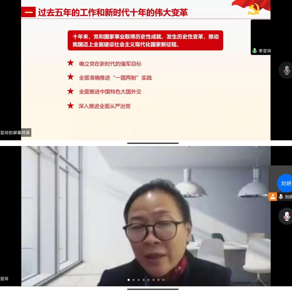 12月19日,为引领同学们坚定不移听党话、跟党走,立志做有理想、敢担当、能吃苦、肯奋斗的新时代好青年。bevictor伟德官网党委委员、经理李亚玲在员工第三党支部宣讲党的二十大精神。支部全体党员通过腾讯会议参加本次宣讲会,支部书记刘妍主持会议。